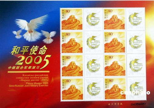 中俄聯(lián)合軍事演習導演部和中國集郵總公司19日聯(lián)合發(fā)行“和平使命—2005”中俄聯(lián)合軍事演習紀念封1枚和專題紀念封4枚,以紀念“和平使命—2005”中俄聯(lián)合軍事演習。這5枚紀念封以精裝卡書和簡裝卡書兩種方式裝幀。圖為精裝卡書中的一版8枚個性化郵票。作者:王麗南