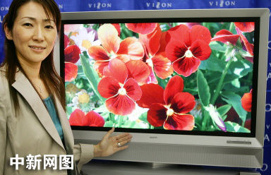 2005年8月23日,日本家用電器巨頭——三洋公司的一位職員展示著該公司最新款42英寸高清等離子電視——“PDP-42HD”。三洋公司將從10月21日起在日本國內(nèi)市場(chǎng)推出“Capujo”牌電視,每臺(tái)電視的價(jià)格預(yù)計(jì)是56萬5千日元(5140美元)