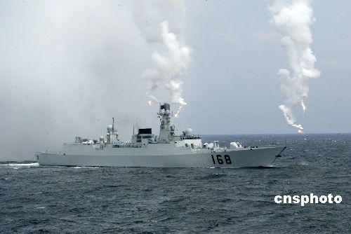 “和平使命-2005”中俄聯(lián)合軍事演習(xí)第三階段8月23日在中國(guó)山東半島及其附近海域舉行。圖為中國(guó)海軍驅(qū)逐艦釋放電磁干擾彈,抗擊來(lái)襲導(dǎo)彈。作者:王麗南
