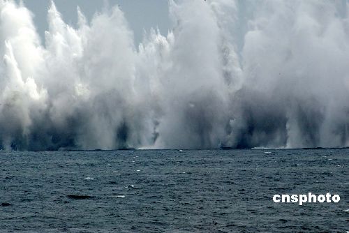 “和平使命-2005”中俄聯(lián)合軍事演習(xí)第三階段8月23日在中國山東半島及其附近海域舉行。圖為驅(qū)逐艦發(fā)射火箭彈擊中目標(biāo)后濺起沖天水柱。作者:王麗南