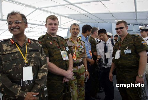 八月二十三日,上海合作組織觀察員國觀察員、俄羅斯軍官等,乘艦艇觀摩在中國山東半島及其附近海域進(jìn)行的“和平使命——2005”中俄聯(lián)合軍事演習(xí)。作者:王麗南