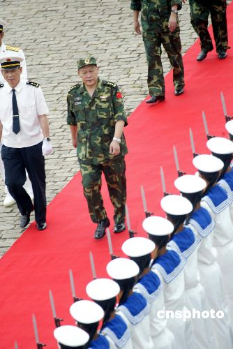 “和平使命-2005”中俄聯(lián)合軍事演習第三階段8月23日在中國山東半島及其附近海域開始。圖為中國人民解放軍總參謀長梁光烈在演習開始時檢閱海軍官兵。作者:王麗南