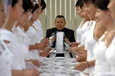 昨天,奧體中心游泳館的一個平臺上,一下子出現(xiàn)了三十位身穿白色婚紗的新娘,這個場面難道是有人在這里組織集體婚禮?看到一旁的攝影機,才知道原來這里是潘長江處女專輯《男人40一枝花》同名歌曲MV的拍攝現(xiàn)場。一張長條桌子兩側(cè)站著30位漂亮的新娘,而眾星捧月之中是身穿黑色燕尾服的笑星潘長江。最搞笑的是當(dāng)老潘揭開面前一只巨大的盤子蓋,原以為是大餐的他失望地發(fā)現(xiàn)里面只放著一個小漢堡。