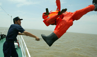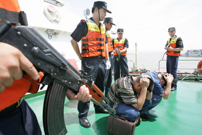 在這次演習中,靠幫和跳幫是緝私隊員著重鍛煉的兩個技術動作!吧嫦幼咚酱遣粫怨月犜捵屛覀兛可先サ。”杭州海關緝私局海查科長楊政說。今年1月,舟山緝私分局的一艘緝私艇在追擊一艘涉嫌走私冰凍白魚的漁船時,漁船邊逃邊擺尾,緝私艇根本無法靠船跳幫。追擊了一天一夜后,在溫州緝私分局一艘緝私艇的夾擊下才終于靠近漁船,緝私隊員在兩船起伏落差較大情況下跳幫過去,控制住了走私漁船。