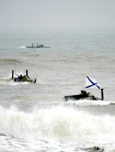 八月二十四日,盡管山東半島天氣惡劣“和平使命—2005”中俄聯(lián)合軍事演習兩棲登陸作戰(zhàn)實兵演練如期進行。圖為參加兩棲登陸作戰(zhàn)演練的陸戰(zhàn)隊員乘裝甲運兵車劈浪向岸邊靠近。作者:王麗南