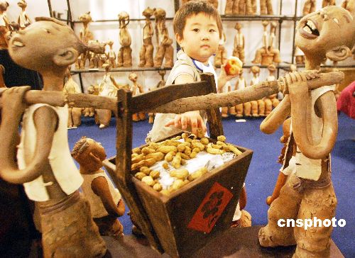 | 八月二十八日,正在北京舉行的“2005中國(guó)藝術(shù)博覽會(huì)”上,匯集了來(lái)自中國(guó)各地的百家藝術(shù)品經(jīng)營(yíng)機(jī)構(gòu)和五百名中外藝術(shù)家,在參展的作品中別具特色中國(guó)陶藝藝術(shù)品引人注目。圖為由中央美術(shù)學(xué)院藝術(shù)研究院的鄭玉奎創(chuàng)作的陶藝作品《農(nóng)家樂(lè)》充滿(mǎn)濃厚的鄉(xiāng)土氣息,造型活潑、生動(dòng)感人。作者:錢(qián)興強(qiáng)