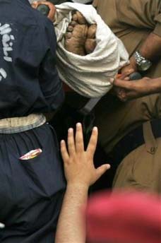 圖為一個(gè)朝拜者伸出手臂竭力想去觸碰遇難親屬的尸體。(章田)