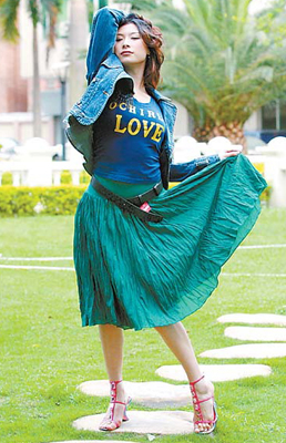 搭配示范:點綴了英文字母的藍(lán)色背心式T恤休閑味十足,下面搭配一件柔軟的綠色綢緞質(zhì)傘裙,為了突出爽滑面料的特色,上身再穿上一件硬挺的牛仔上衣,整體搭配有柔有剛,充分體現(xiàn)了各種面料的特征。其實,這套搭配仍遵循著體現(xiàn)淑女風(fēng)格的原則,因此牛仔上衣雖然看似粗獷,實際上牛仔上衣具有優(yōu)雅的圓形領(lǐng)口設(shè)計,并加入了漂亮的復(fù)古式胸針,整體穿著仍保持著淑女風(fēng)范。