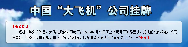 | “中國的汽車、遠洋貨輪、載人航天都有自己的品牌產(chǎn)品,而中國大飛機卻至今沒有,作為航空人,我感到很慚愧!毙氯稳珖䥇f(xié)委員、中國航空工業(yè)第一集團公司第一飛機設(shè)計研究院院長吳光輝接受中新社記者專訪,對中國大飛機的研制感觸頗深……<詳細(xì)> |