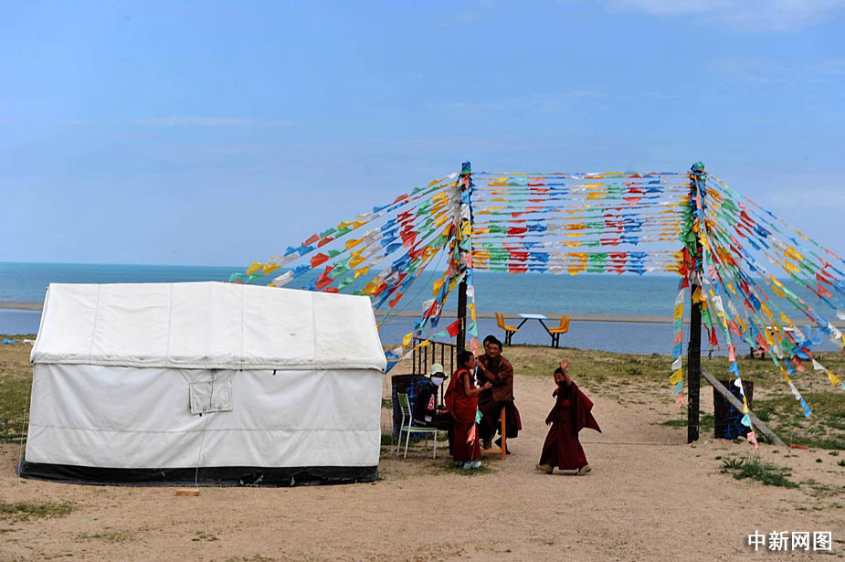 圖為沿湖的藏族同胞。