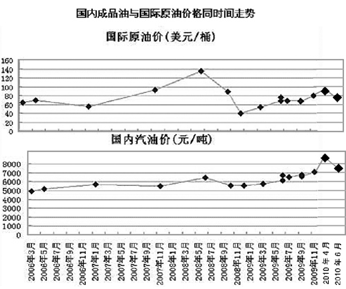 記者查資料發(fā)現(xiàn),2008年6月20日國際油價為每桶132美元,目前為80美元,與此同時,我國的油價卻每噸上漲了1710元。