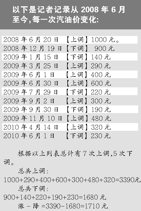 在帖子里,網(wǎng)友列出了從2008年6月至2010年6月,每一次國家發(fā)改委對油價的調(diào)整,得出結(jié)論是漲7次,降4次,每噸汽油的漲幅總額為3390元,而每噸汽油的降幅總額為760元,于是得出計算結(jié)論:2年前的油價是74美元,現(xiàn)在還是74美元,可是汽油價卻漲了2630元1噸。