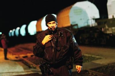 11月8日,在德國(guó)丹嫩貝格,一名防暴警察在運(yùn)載核廢料的列車旁工作。