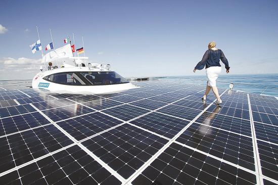 12月8日,在墨西哥坎昆,一名婦女行走在以太陽能為動(dòng)力的“星球陽光”號雙體船的甲板上!靶乔蜿柟狻遍L31米、寬15米,被制造商稱為世界上最大的太陽能動(dòng)力船。 新華社發(fā)
