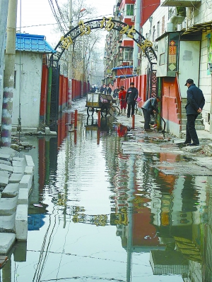 據(jù)居民介紹,西馬場北里只有這一條東西走向的胡同,居民出門、購物都必須走這條路。可現(xiàn)在路面每天汩汩往外冒臭水,人們只好用方磚沿著胡同北面鋪了一條窄路勉強(qiáng)通行,而現(xiàn)在那些方磚也被臭水淹沒了,居民通行更加困難。