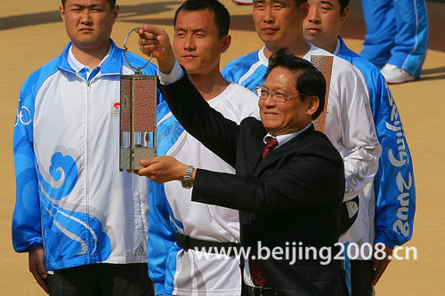 北京奧運(yùn)會(huì)圣火交接儀式在希臘當(dāng)?shù)貢r(shí)間15時(shí)(北京時(shí)間20時(shí))在泛雅典體育場(chǎng)舉行。在交接儀式上,北京奧組委主席劉淇從希臘奧委會(huì)主席基里亞庫手中接過奧運(yùn)會(huì)圣火,并點(diǎn)燃了火種燈。圖為劉淇用圣火點(diǎn)燃火種燈并向世人展示。圖片來源:北京奧運(yùn)會(huì)官方網(wǎng)站