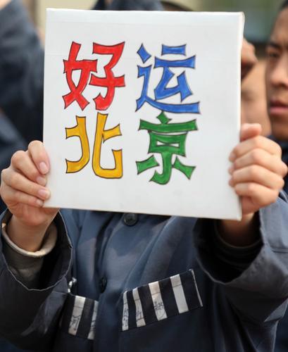一名服刑人員舉著寫有“好運(yùn)北京”的牌子。