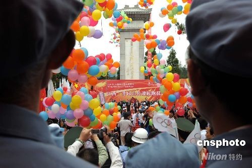 5月15日,奧運(yùn)圣火開始在江西井岡山傳遞,在起跑儀式上穿著紅軍服裝的合唱隊(duì)為祥云火炬?zhèn)鬟f鼓勁加油。 中新社發(fā) 廖攀 攝