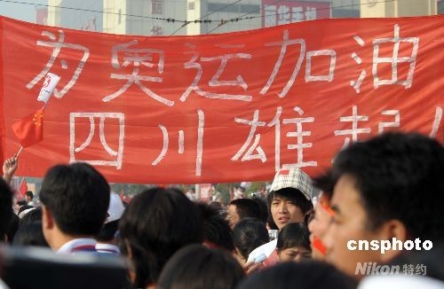 5月16日,奧運圣火在江西南昌傳遞,在八一廣場舉行的起跑儀式上,民眾打起“為奧運加油 四川雄起”橫幅,為四川地震災民鼓勁加油。 中新社發(fā) 廖攀 攝