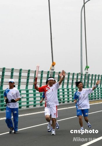 5月22日,奧運火炬?zhèn)鬟f寧波站最后一棒火炬手嚴宏軍,高舉火炬跑過杭州灣跨海大橋。這是全世界跨度最長的跨海大橋,嚴宏軍是這座大橋的建設者之一。 中新社發(fā) 周兆軍 攝