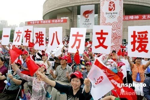 5月23日,北京奧運(yùn)圣火在上海開始傳遞。上海市民在喜迎奧運(yùn)圣火的同時(shí),更心系著四川地震災(zāi)區(qū)人民,在火炬?zhèn)鬟f沿途高舉“一方有難,八方支援”、“團(tuán)結(jié)一致,眾志成城”等橫幅,表達(dá)和四川地震災(zāi)區(qū)民眾共度難關(guān)的決心。 中新社發(fā) 湯彥俊 攝