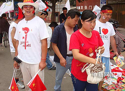 記者上午在運城的街頭看到,各家商戶門面都懸掛奧運彩旗,出租車、三輪車、摩托車等都自發(fā)的在車頭車尾插上彩旗。印有各色奧運標(biāo)志圖案的文化衫火了運城的一條街。