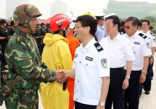 北京奧運安保工作協(xié)調小組組長、公安部黨委副書記、副部長劉京,國務院副秘書長汪永清,國家反恐辦主任、公安部黨委委員、副部長孟宏偉和天津市委副書記、市長黃興國等領導一同觀看了演習。(徐燦)