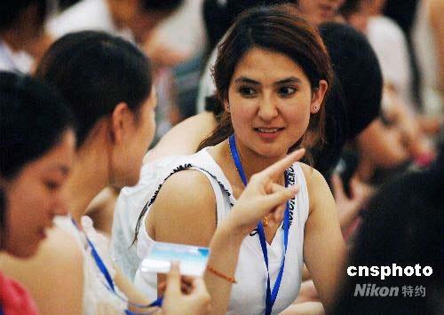 名少數(shù)民族志愿者在北京參加奧運(yùn)頒獎(jiǎng)儀式培訓(xùn)開(kāi)班儀式。中新社發(fā) 王東明 攝
