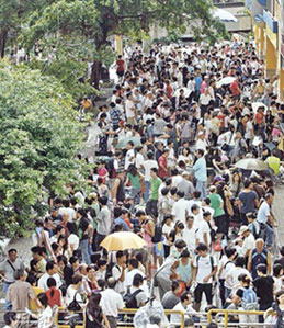 七月十四日,離中銀香港發(fā)行面額二十元港幣的奧運紀念鈔票還有兩天時間,香港中銀大廈外已有不少市民排隊等候。 中新社發(fā) 武仲林 攝