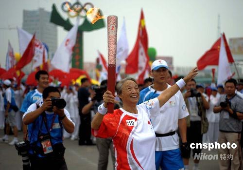 7月15日,出演過《希望的田野》等電影的著名演員柏青在東鎮(zhèn)廣場傳遞完松原最后一棒火炬后,奧運火炬在吉林松原的傳遞結(jié)束。 中新社發(fā) 廖攀 攝