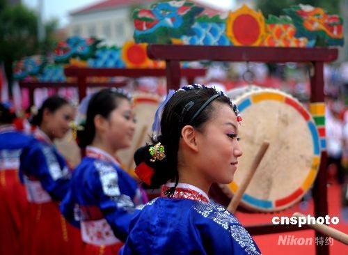 7月15日下午,奧運(yùn)火炬在吉林市傳遞,朝鮮族女鼓樂(lè)手擊打鼓樂(lè)歡慶火炬?zhèn)鬟f。 中新社發(fā) 廖攀 攝