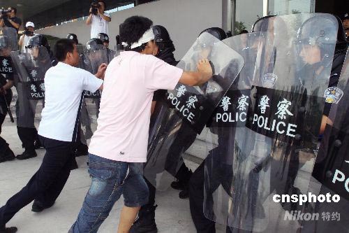 奧運村法庭舉行奧運安保演練。發(fā)生“突發(fā)事件”時,法警使用盾牌將鬧事“當事人”與遭到圍攻的法官分隔開。中新社發(fā) 劉新 攝