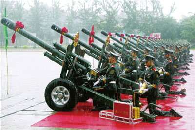 昨天上午,士兵在大雨中試放禮炮,這意味著08式迎賓禮炮正式交付使用。(圖片來源:京華時報,記者張沫 周宇 程晨攝影報道)