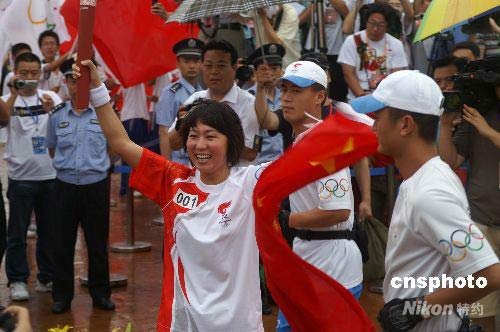 7月19日上午8時(shí),北京奧運(yùn)火炬在大連傳遞,傳遞路線從大連經(jīng)濟(jì)技術(shù)開發(fā)區(qū)發(fā)現(xiàn)王國(guó)主題公園開始,到經(jīng)濟(jì)技術(shù)開發(fā)區(qū)中華武館結(jié)束,全長(zhǎng)9.41公里。大連市共有火炬手208名,圖為中國(guó)第一個(gè)歐文斯獎(jiǎng)獲得者、奧運(yùn)冠軍王軍霞傳遞第一棒火炬。 中新社發(fā) 宋太盛 攝