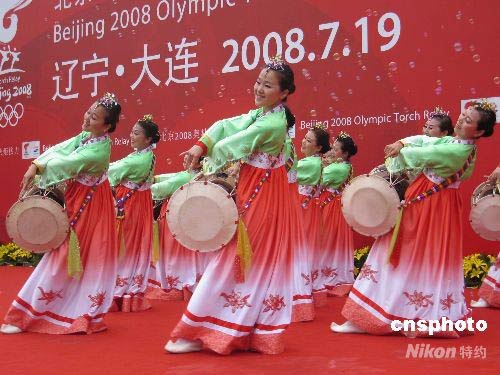 圖為大連民眾跳起民族舞蹈激情迎北京奧運火炬?zhèn)鬟f。 中新社發(fā) 沈殿成 攝