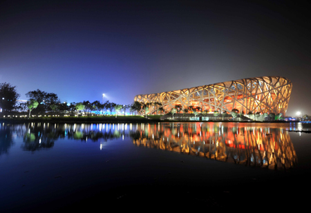 7月18日的臺灣《中國時報》這樣記錄了7月16日晚在“鳥巢”體育館進行的北京奧運會開幕式的第二次帶妝彩排場景。這場彩排首次公開了“鳥巢”夜景照明系統(tǒng)并燃放了禮花。