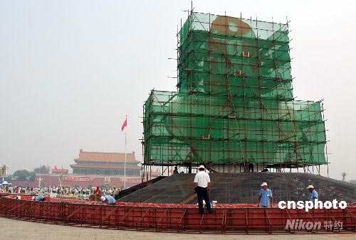 北京天安門廣場中央“中國印·舞動的北京”奧運(yùn)會會徽花壇與噴泉水池正在建立之中。其中“中國印”為LED光源燈箱,可以旋轉(zhuǎn),整個廣場花壇都采用了夜景照明設(shè)計,達(dá)到白天看花,晚上看燈的效果。中新社發(fā) 張雙雙 攝