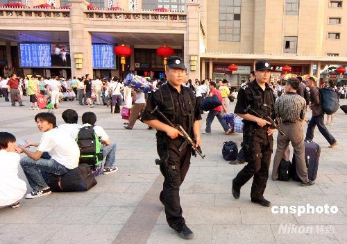 7月22日,特警在北京站廣場巡邏。北京鐵路警方昨日宣布,為確保奧運會安全,鐵路安檢從即日起全面升級,只要進入火車站就要接受各種安檢,其中以前不要求檢查的液體,從現(xiàn)在起也要“過機”。 中新社發(fā) 吳芒子 攝