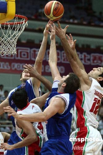 7月30日,正在江蘇南京進(jìn)行的國際籃聯(lián)2008鉆石杯男籃第二日比賽,伊朗隊72比70險勝塞爾維亞隊(藍(lán))。圖為雙方在籃下激烈拼搶。中新社發(fā) 盛佳鵬 攝