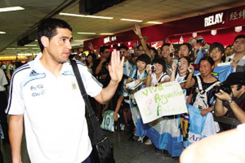 12時(shí)15分,阿根廷足球隊(duì)稍事休息后,魚(yú)貫步出候機(jī)大廳,早已等候在此的上海球迷立即歡呼起來(lái),他們有的舉著寫(xiě)有運(yùn)動(dòng)員名字的牌子,有的高喊運(yùn)動(dòng)員的名字。里克爾梅等球星,也熱情地向球迷們揮手致意。