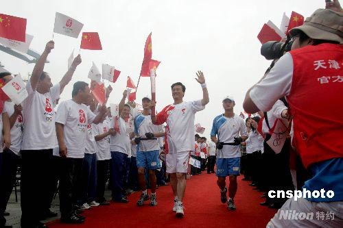 8月1日,奧運火炬在天津濱海新區(qū)傳遞,起跑點設(shè)在天津港集裝箱碼頭。圖為“藍領(lǐng)專家”孔祥瑞擔任首棒火炬手傳遞奧運火炬。 中新社發(fā) 田齊 攝
