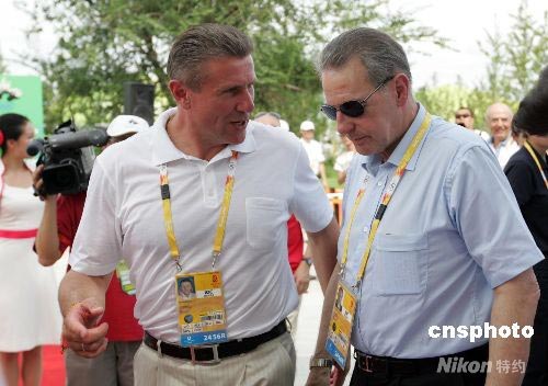 國(guó)際奧委會(huì)主席羅格與國(guó)際奧委會(huì)運(yùn)動(dòng)員委員會(huì)主席、前世界著名撐竿跳高運(yùn)動(dòng)員謝爾蓋·布勃卡(左)在一起交談。 中新社發(fā) 杜洋 攝