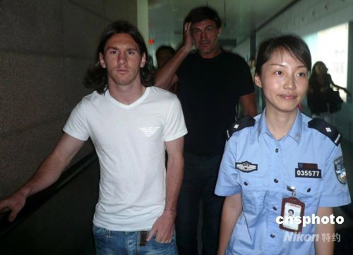 八月一日,阿根廷足球明星梅西(左),搭乘法航一一六次航班飛抵上海,在安保人員陪同下走出候機(jī)樓,與先期抵達(dá)的阿根廷國奧隊匯合,備戰(zhàn)將于八月七日開始的北京奧運會足球上海賽區(qū)比賽。 中新社發(fā) 劉友平 攝