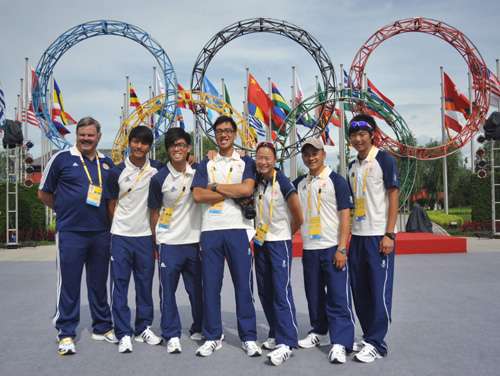圖:香港單車隊(duì)與賽艇隊(duì)成員在奧運(yùn)五環(huán)前合照(大公報(bào)攝)