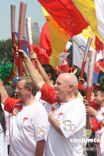 圓滿完成火炬?zhèn)鬟f的外籍火炬手手捂胸口,深情祝福北京,祝福四川。 中新社發(fā) 郭曉帆 攝