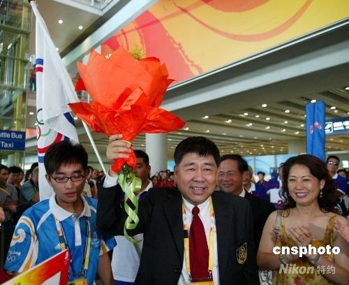 8月3日下午,中華臺北奧運代表團(tuán)一行50人,經(jīng)香港轉(zhuǎn)機(jī)抵達(dá)北京,征戰(zhàn)2008年北京奧運會。圖為代表團(tuán)抵達(dá)北京后,中華臺北奧運代表團(tuán)主席蔡賜爵受到熱烈歡迎。