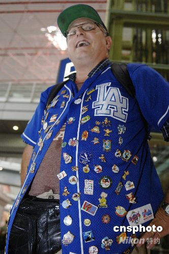 8月4日,來自美國加里福利亞的Brad Frank在北京機場展示其收集的奧運會紀念章,據(jù)其介紹,他有上萬枚紀念章,是個名副其實的奧運迷。中新社發(fā) 王東明 攝