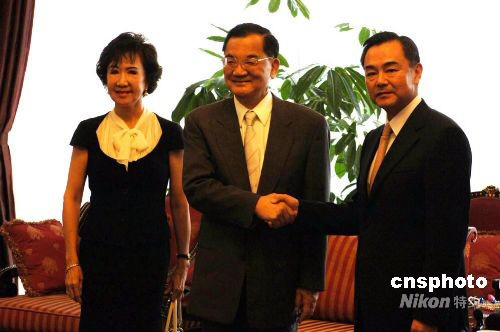 8月5日下午,中國國民黨榮譽(yù)主席連戰(zhàn)夫婦一行抵達(dá)北京首都機(jī)場,將觀禮北京奧運開幕式。圖為中共中央臺辦主任王毅在機(jī)場貴賓室會見連戰(zhàn)夫婦一行。中新社發(fā) 王東明 攝