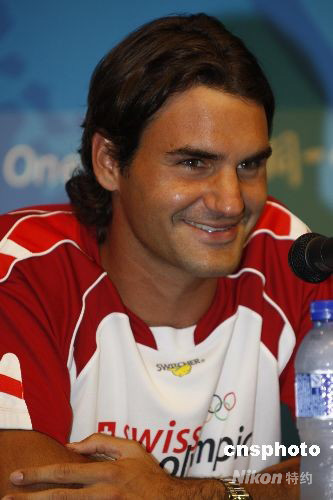 8月7日,瑞士網(wǎng)球天王羅杰·費(fèi)德勒在北京奧運(yùn)新聞中心召開發(fā)布會。費(fèi)德勒將在8月8日開幕式當(dāng)天度過自己27歲生日。 中新社發(fā) 杜洋 攝
