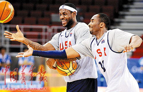 8月7日,科比(右)和詹姆斯在訓(xùn)練中搶球。當(dāng)日,美國男籃在五棵松奧運(yùn)籃球館備戰(zhàn)8月10日與中國隊(duì)的比賽。 劉占坤攝